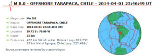 Latest News M 8.2 EARTHQUAKE – OFFSHORE TARAPACA, CHILE April 1, 2014 By QWJanuary 29, 2014Less 1 min read135 Views ShareTweetPinShare Previous PostM 6.0 EARTHQUAKE – SOUTH OF PANAMA April 2, 2014 Next PostM 4.8 EARTHQUAKE – YELLOWSTONE NATIONAL PARK, WYOMING March 30, 2014 You May Also Like January 29, 2015 M 6.8 EARTHQUAKE – NEW BRITAIN REGION, P.N.G. – May 1, 2015 May 26, 2022 Strong Magnitude 7.2 Earthquake Strikes Southern Peru | May 26, 2022 January 22, 2022 Strong Magnitude 6.3 Earthquake strikes Shikoku, Japan | Jan 21, 2022 January 29, 2014 M 6.9 EARTHQUAKE – AEGEAN SEA – May 24, 2014
