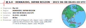 Latest News M 6.2 EARTHQUAKE – HOKKAIDO, JAPAN REGION – June 8, 2015 By QWJanuary 29, 2015Less 1 min read106 Views ShareTweetPinShare Previous PostM 6.1 EARTHQUAKE – ANTOFAGASTA, CHILE – June 10, 2015 Next PostM 7.8 EARTHQUAKE – BONIN ISLANDS, JAPAN REGION – May 30, 2015 You May Also Like December 3, 2023 Major Magnitude 7.5 Earthquake Strikes MINDANAO Philippines | Dec 2, 2023 January 1, 2022 Global Earthquakes greater than Magnitude 7 for the year of 2021 July 28, 20240 Strong M9.9 Solar Flare | July 28, 2024 February 23, 2024 Major X6.4 Solar Flare | Feb 22, 2024