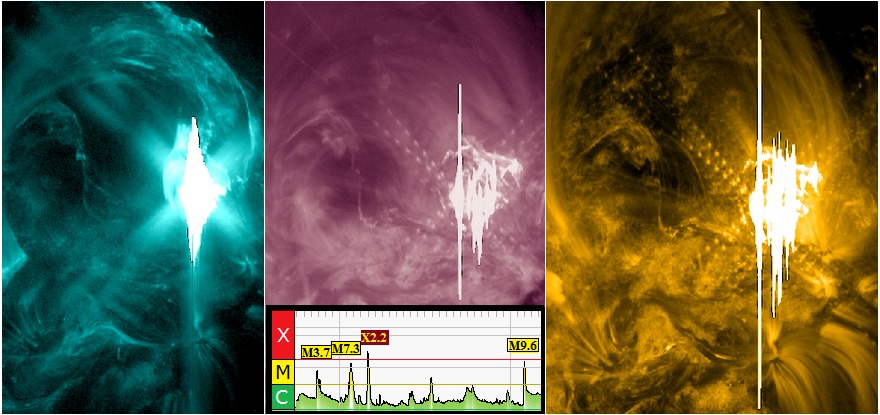 A near X-Flare officially peaking to M9.6 at 01:59 UTC (Apr 21) around Earth facing sunspot region 12993 in the northeast quadrant of the solar corona. This region is now in a good position for Earth directed eruptions in the coming days.