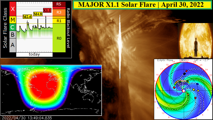 A Major X1.1 solar flare was just observed off the western limb at 13:47 UTC today April 30th. The Source was departing region 12994 become eruptive as it was rotating off the earth-facing side of the solar disk therefore all Coronal Mass Ejections (CMEs), they will be directed away from our planet.