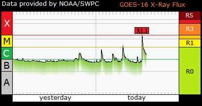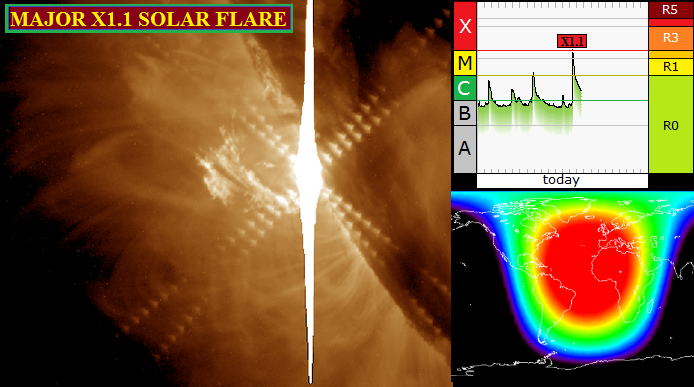 New Active Region AR13006 just unleashed a Major X1.1 Solar Flare at 13:31 UTC May 3rd. The new active region is yet to fully rotate onto the earth-facing side of the disk erupted in a spectacular eruption. The region will be assigned a new sunspot number later today. No CME is visible as yet but it will not have any earth bound component.