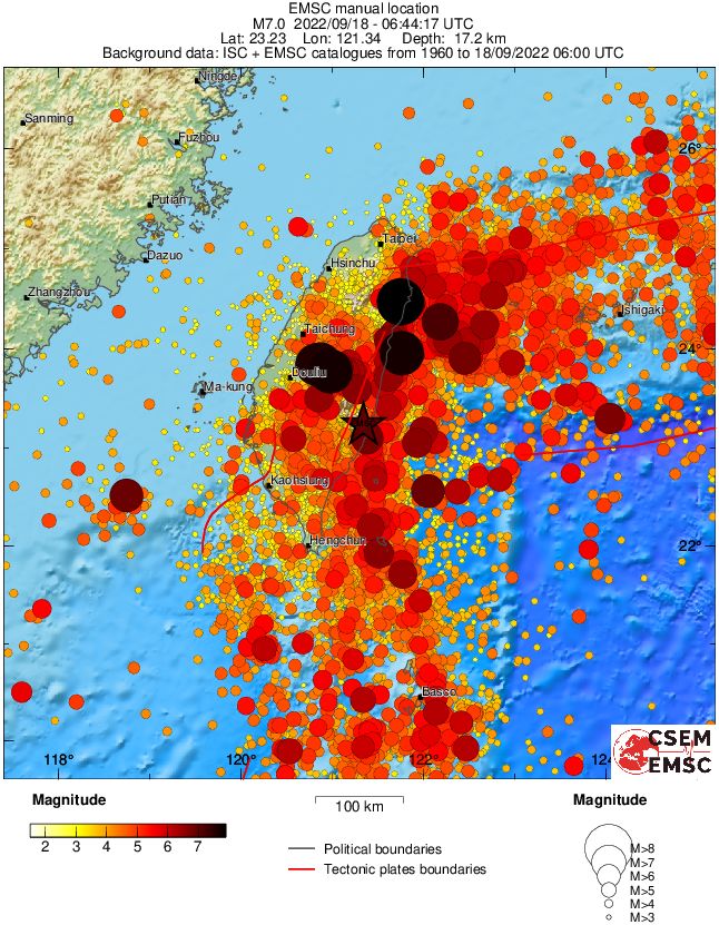 A 6.9 Magnitude Earthquake hit the sparsely populated southeastern part of Taiwan on Sunday, causing damage including derailed train carriages, and sparking tsunami warnings. Todays quake followed a 6.4 magnitude temblor on Saturday evening in the same area, which caused no casualties. The estimated tsunami height is 1 meter. People in the area are advised to move to higher ground.