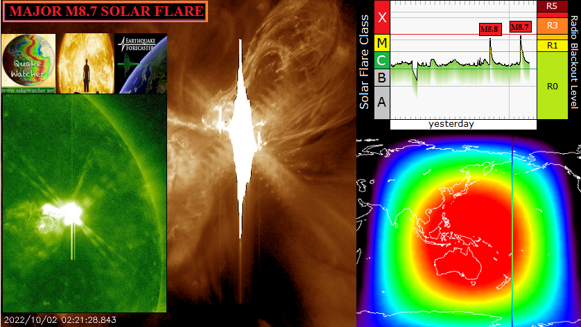 Two strong M-Class Solar Flares were unleashed off the solar corona from Active Region 13110 on October 2nd. The First was an M5.7 Blast then at 02:21 a much larger M8.7 Solar Flare ripped off the solar surface. Both eruptions took place while in an earth-facing position so the incoming (CME’s) Coronal Mass Ejections will be headed to the earth in 2-3 days where very strong geomagnetic storms could be possible. Two large Coronal Mass Ejections (CME’s) are now visible on the Soho Satellite and does look to have an earth-directed component which should provide significant geomagnetic storming sometime Oct 4-5 where Aurora should be visible at mid to high latitudes.