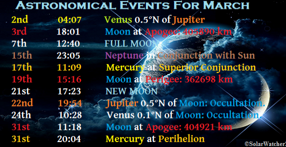 Venus will be featured in a double alignment where it will be the meat in the grand cross sandwich. Earth-Venus-Jupiter(Geocentric) March 2nd will align while Mars-Venus-Saturn align (heliocentric) March 3rd should initiate high solar activity and the potential for big flares will be possible with the coronal mass aimed towards the Venus direction is the forecast. So lets look for a new sunspot to be on the eastern limb of the solar corona and if fully rotated onto the earth side of the disk we could bet a big X-Class solar flare of note, if the new active region has yet to turn the corner we should have a limb-obscured flare event.