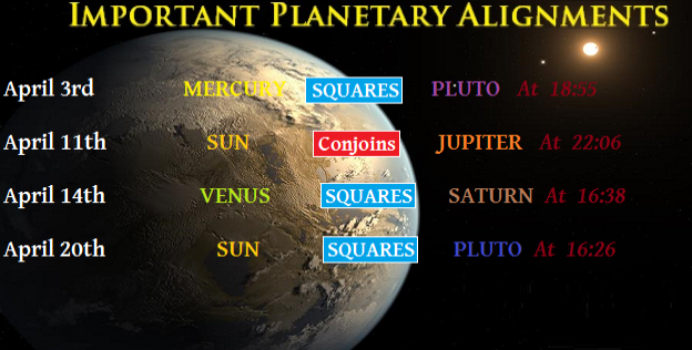 One big planetary alignment comes April 11 with the Sun Jupiter Conjunction then we have a series of important planetary squares.