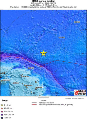 A strong Magnitude 6.6 earthquake rocked the Atlantic Ocean this afternoon, roughly 350 miles east of San Juan, Puerto Rico and roughly 125 miles north of Antigua and Barbuda, the epicenter was located at a depth of 8 km; the quake struck at 4:28 pm Eastern Time. The 6.6 magnitude earthquake was followed by a nearby 4.2 magnitude aftershock, which struck from a depth of 10 km. The second earthquake struck at exactly 5 pm ET. The National Weather Service’s Tsunami Warning Center, assuring residents there is no tsunami threat at this time.