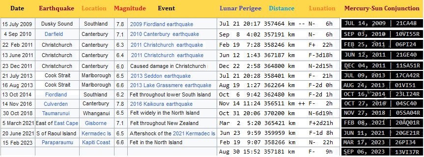 It is worth noting that the Earth-Mercury-Sun planetary alignment does have an correlative symmetry with strong destructive Earthquakes in the New Zealand Mainland, and now has a long correlative history of matching this alignment into the Lunar Perigee, the closer the Lunar perigee is to Super-Moon the stronger the Earthquake seems to be.