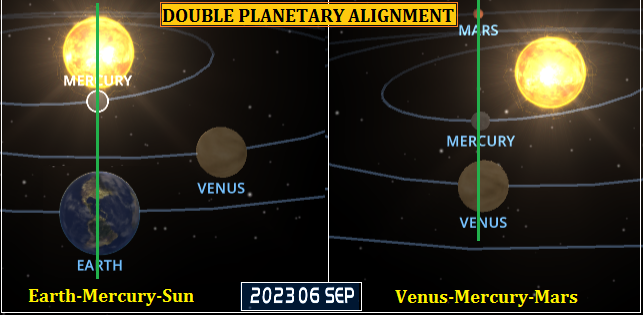 A rare double planetary alignment will take place during September 6, 2023 where planet Mercury will be the middle pin in both planetary connections. The last time fast moving Mercury moved into both of the same geometry was 200+ years ago so this day provides an interesting dynamic and rare celestial phenomena.