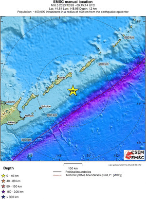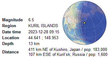 A strong Earthquake registered by the EMSC as M6.5 hit the Kuril Islands at 09:15 UTC on December 28, 2023. The agency is reporting a depth of 13 km (8 miles)